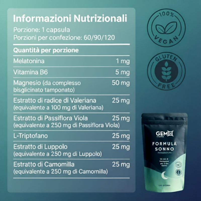 Riposare bene è un vero atto di cura. Formula Sonno, totalmente senza glutine e 100% vegana, è pensata per chi desidera un sonno profondo, leggero e rigenerante, senza compromessi. Una combinazione di ingredienti naturali e puri che rispettano il corpo, l’etica e il pianeta.